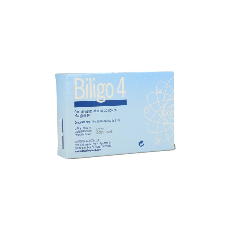 BILIGO 4 (manganeso) es un oligoelemento esencial para el organismo, ya que el cuerpo requiere dosis muy pequeñas aunque muy necesarias, y está relacionado con la actividad de muchas enzimas.