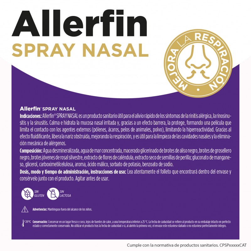 ALLERFIN SPRAY NASAL de Eladiet es un producto sanitario eficaz en casos de congestión nasal, rinitis alérgica y sinusitis, ya que alivia rápidamente los síntomas y previene de posteriores sustancias que provoquen reacciones alérgicas.