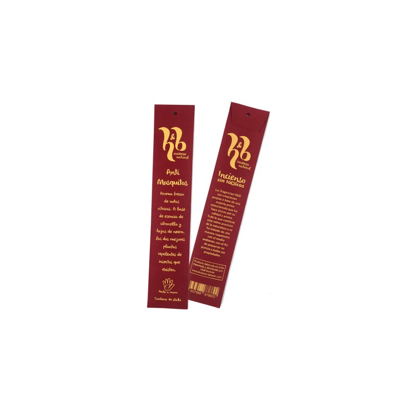 Incieso natural (H&B) antimosquitos con aroma fresco de notas cítricas, pues contiene esencia de citronela y hojas de neem. Certificado ECOCERT
